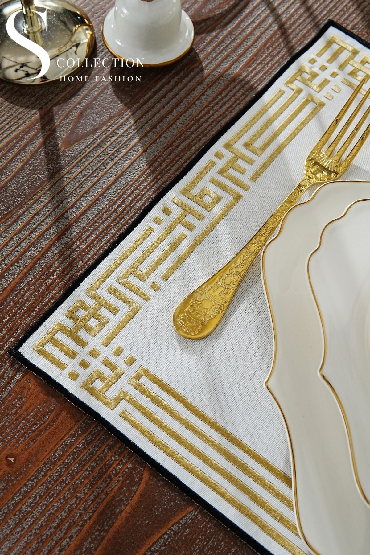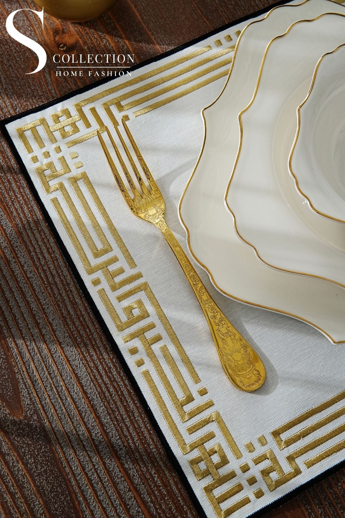 طقم مفارش أطباق - تصميم شهر الخير والبركة رمضان - تطريز ذهبى واسود - قماش مقاوم للماء - ١٢ شخص - ١٢ قطعة