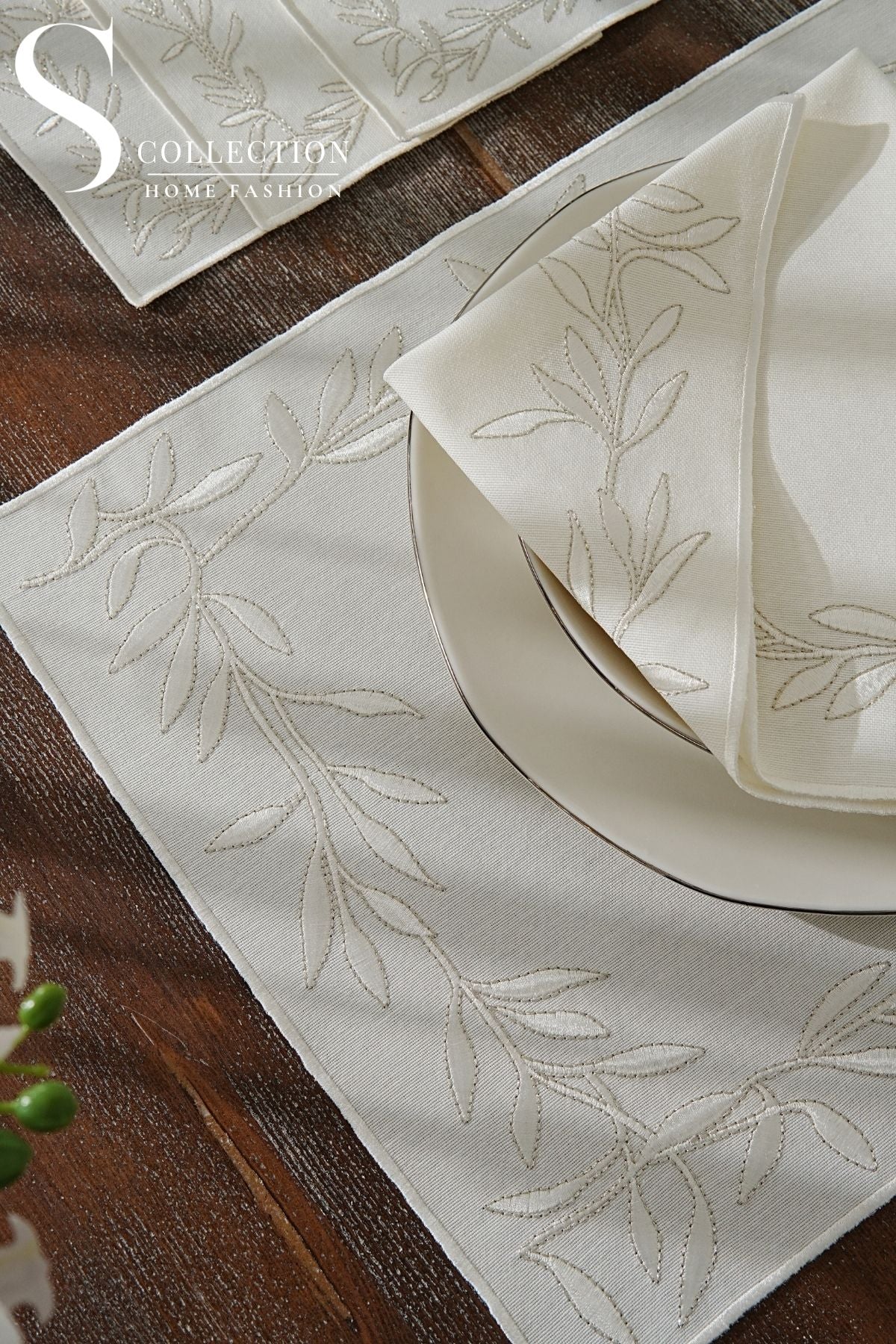 طقم مفارش سفرة - تصميم فلاور - تطريز فضى لامع واوف وايت - قماش مقاوم للماء - ٦ اشخاص - ٢٤ قطعة - طقم كامل
