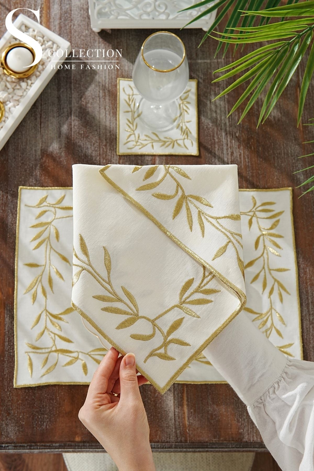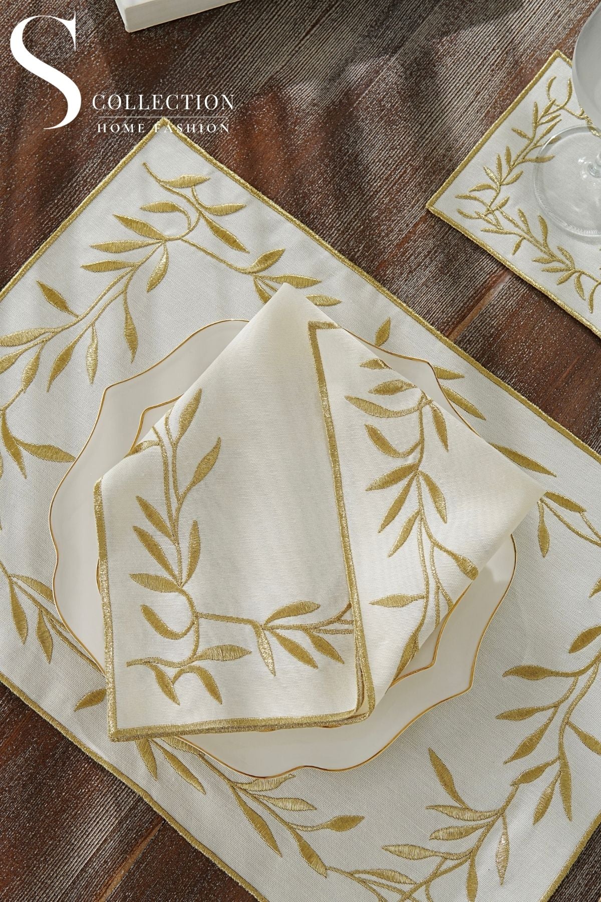 طقم مفارش سفرة - تصميم فلاور - تطريز ذهبى لامع - قماش مقاوم للماء - ٦ اشخاص - ٢٤ قطعة - طقم كامل