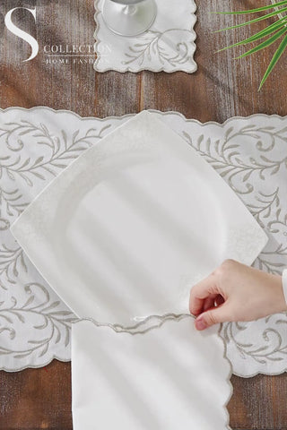 طقم مفارش سفرة - تصميم زهرة الليلك - تطريز فضى لامع - قماش مقاوم للماء - ٦ اشخاص - ٢٤ قطعة - طقم كامل