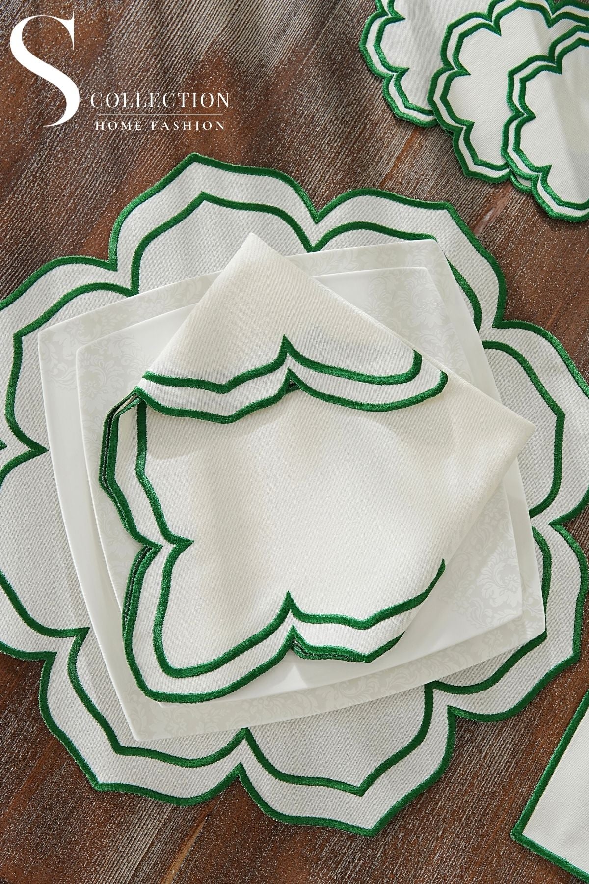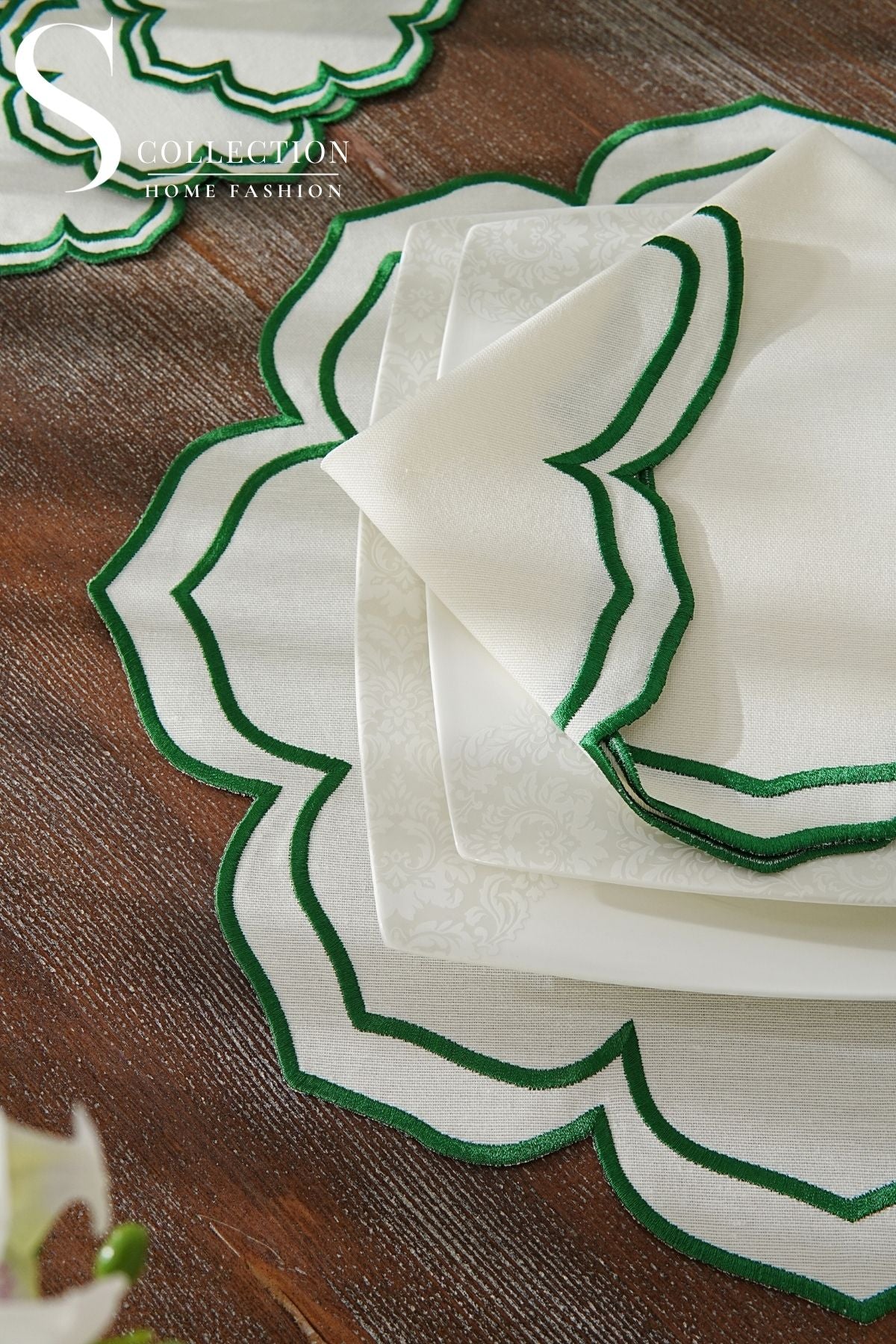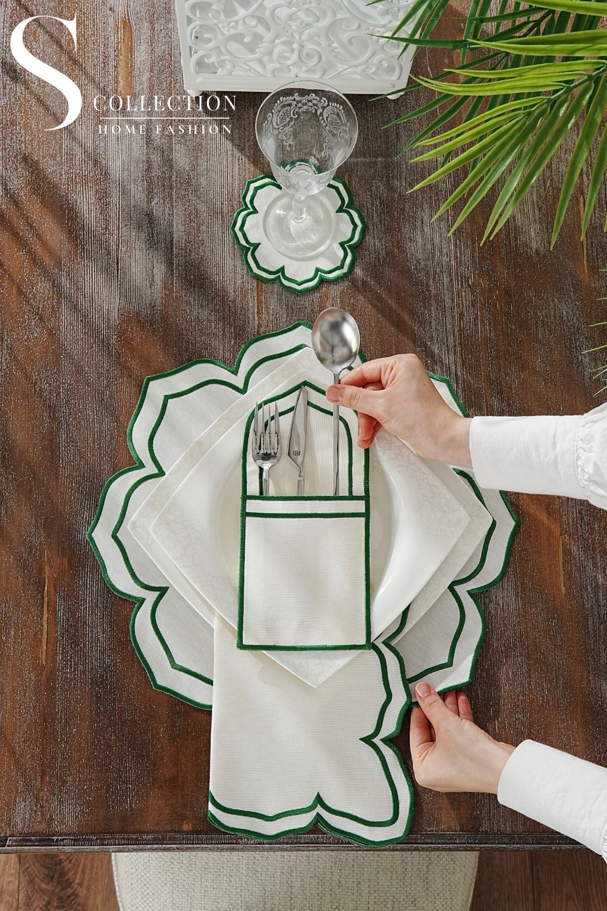 طقم مفارش سفرة - تصميم فاليرا - تطريز اخضر - قماش مقاوم للماء - ٦ اشخاص - ٢٤ قطعة - طقم كامل