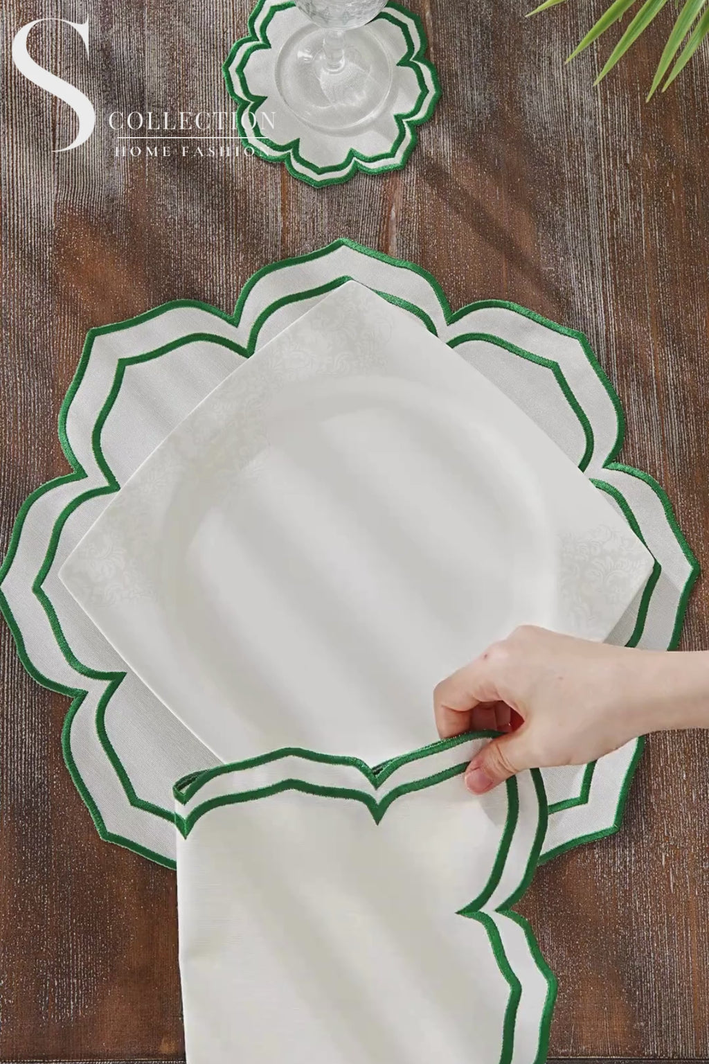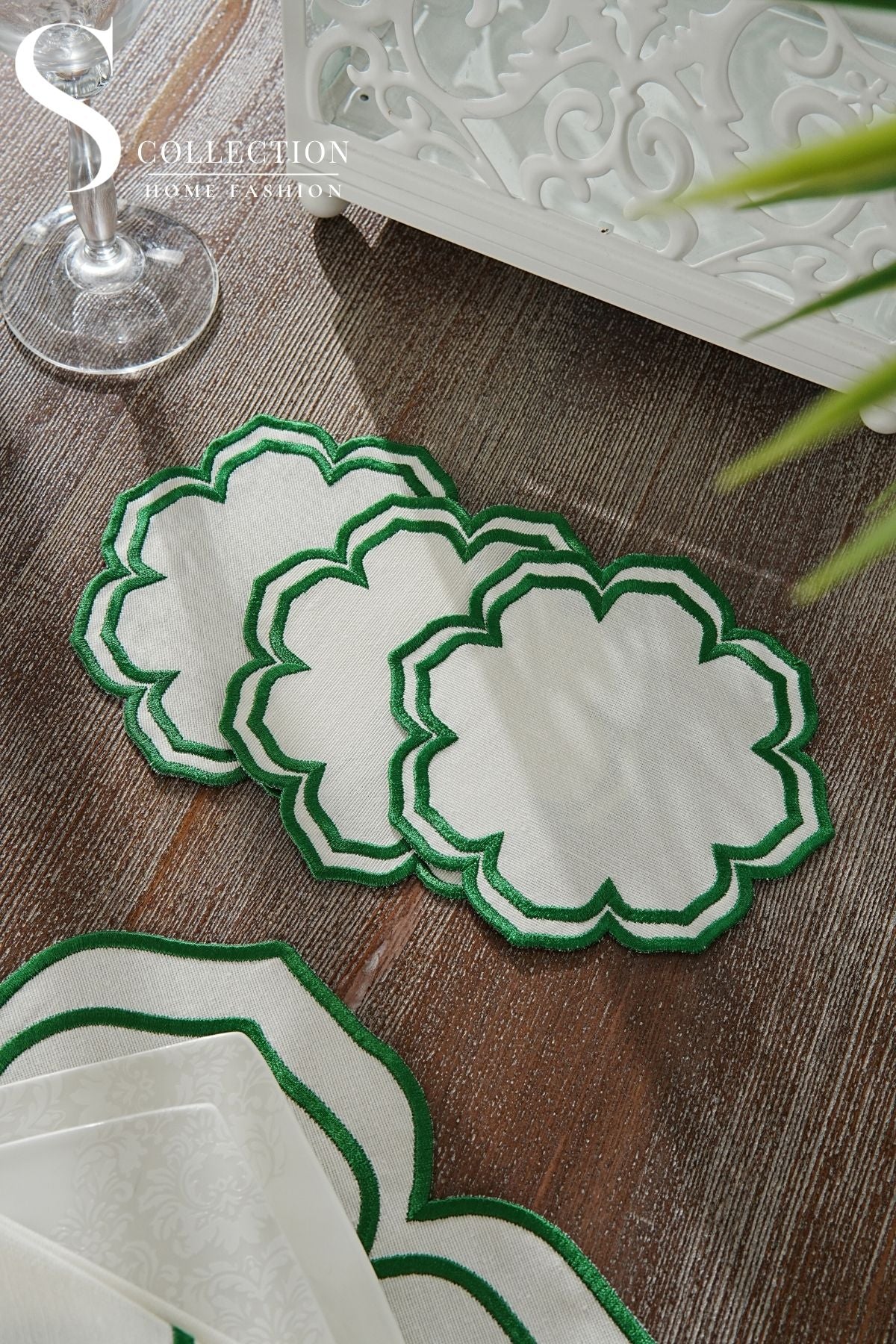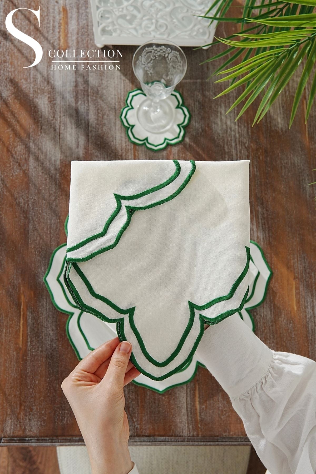 طقم مفارش سفرة - تصميم فاليرا - تطريز اخضر - قماش مقاوم للماء - ٦ اشخاص - ٢٤ قطعة - طقم كامل