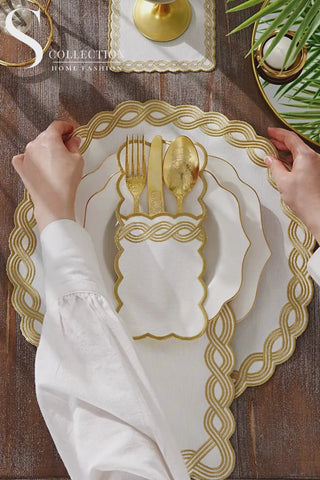 طقم مفارش سفرة - تصميم أوشن بريد - تطريز ذهبى - قماش مقاوم للماء - ٦ اشخاص - ٢٤ قطعة - طقم كامل