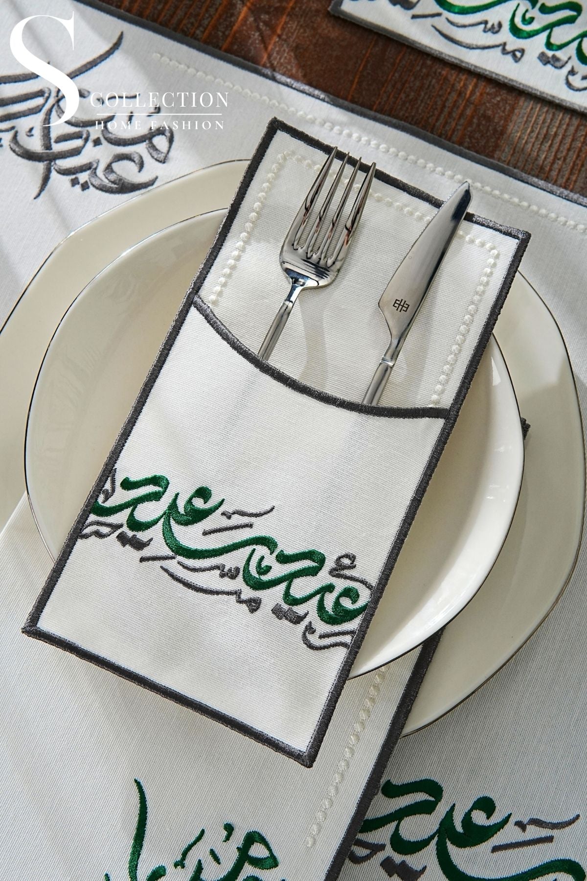 Eid Saeed Design Green and Grey Placemat Set - Waterproof Fabric - 6 Persons - 24 Pcs. Full Set