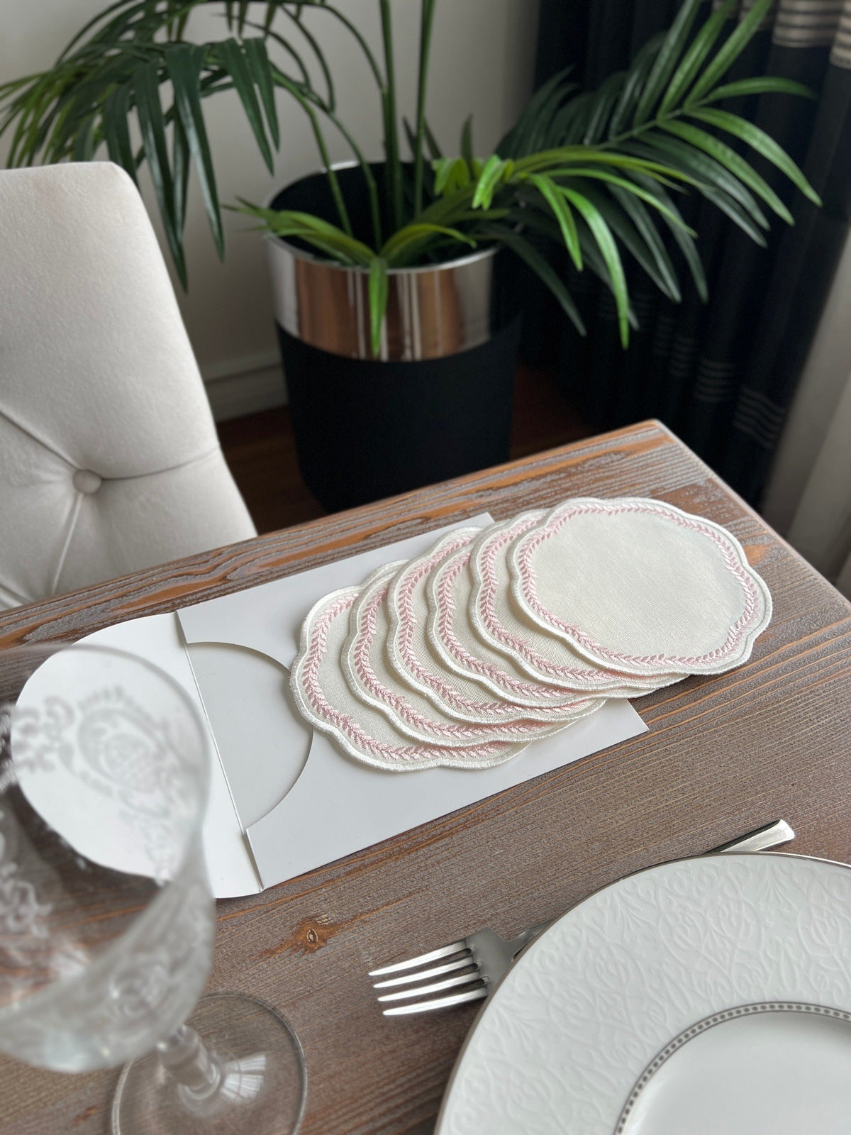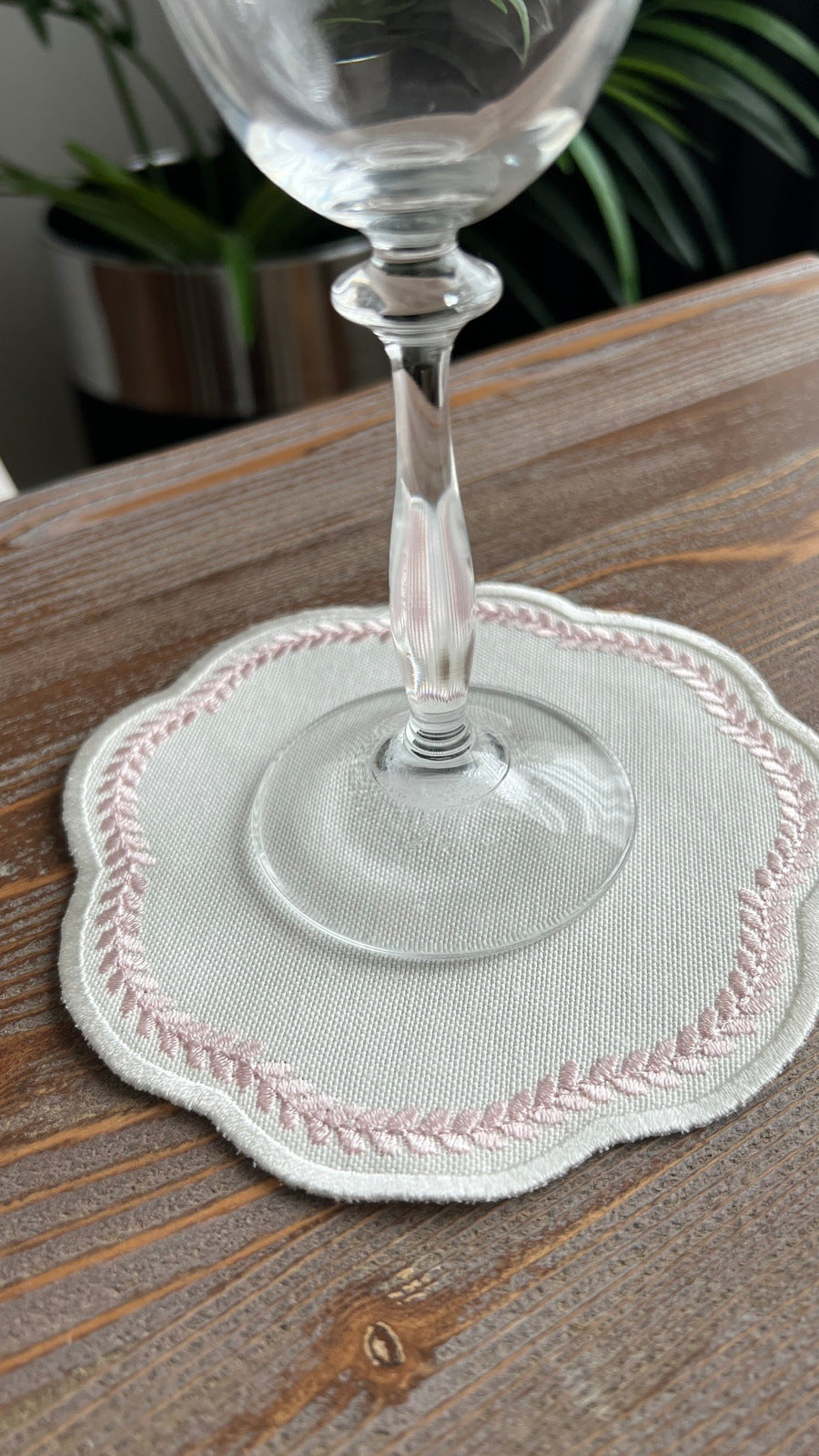Leafy Allure Design Cocktail Napkin - Waterproof Fabric - Pink Embroidered